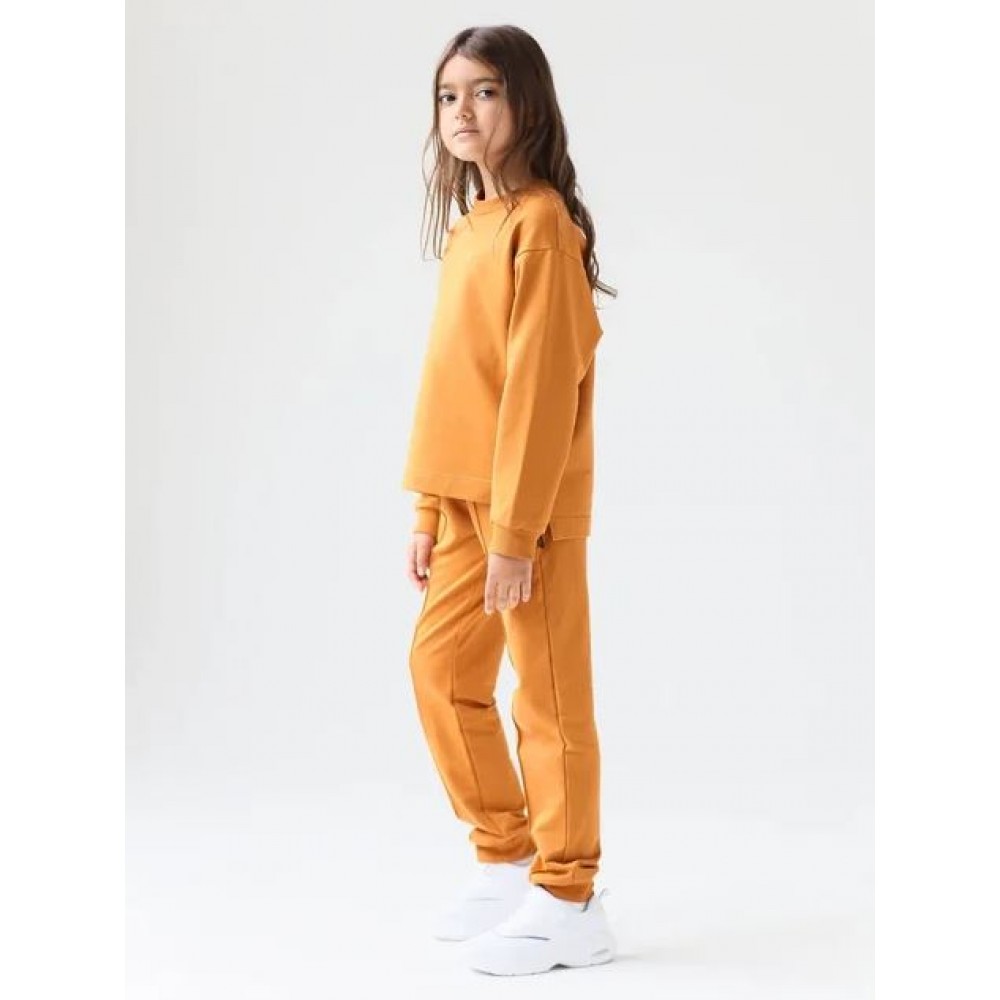 Зауженные брюки с декоративной простроченной стрелкой по всей длине и манжетами по низу. Широкий пояс на удобной резинке. Детский комплект изготовлен из легкого натурального футера двунитки с петелькой на изнанке.
